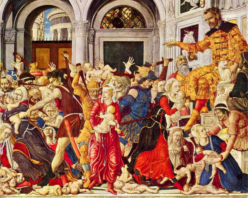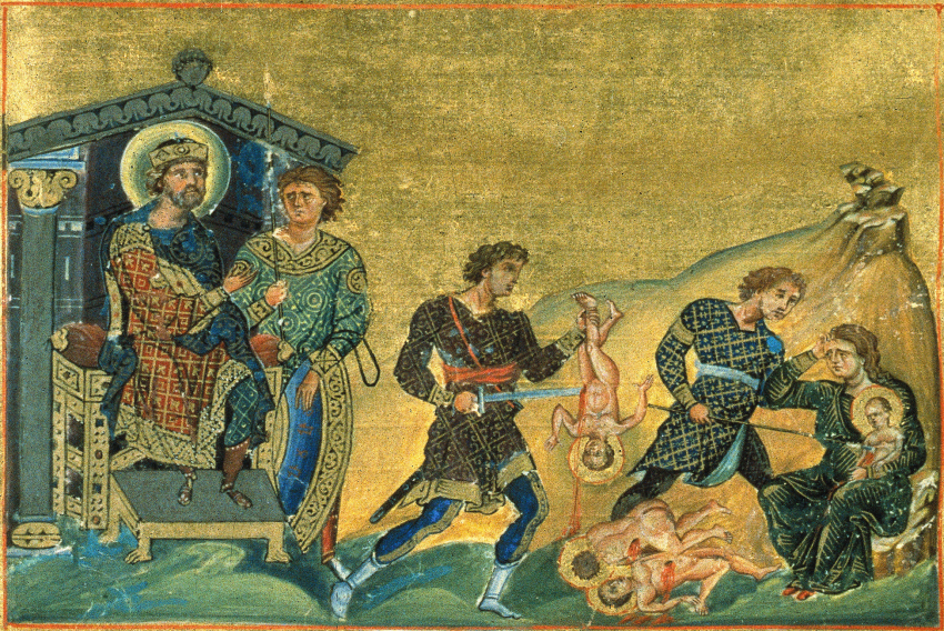 Новозаветное предание гласит, что волхвы после появления на свет Иисуса Христа отправились выразить почтение новорожденному. Однако они перед этим не сообщили о местонахождении младенца правителю – царю Ироду. Мужчина пришёл в ярость из-за поступка колдунов, из-за чего издал указ: избить всех младенцев на территории Вифлеема, возраст которых не достигает 2 лет.