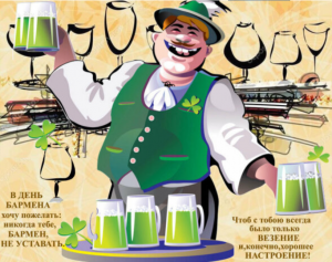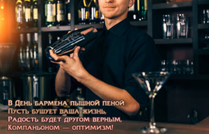 Дорогой бармен, прими наши самые искренние поздравления: будь терпелив в работе и никогда не бойся трудностей. Чтобы госпожа удача была тебе лучшим другом. Дабы в твоем нелегком деле у тебя все всегда получалось. У тебя почетная профессия, так пускай твоя работа сопровождается только хорошим настроением. Чтобы тебе всегда удавалось легко находить подход к людям, так пускай твоя коммуникабельность сыграет тебе в жизни добрую службу. Будь всегда и во всем первым. А еще желаем простого человеческого счастья.