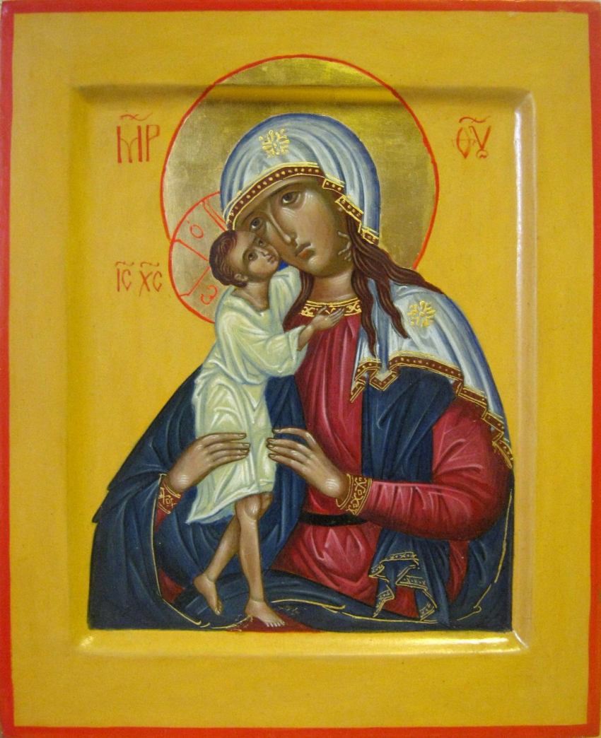 Радуйся, Благодатная Богородице Дево,/ во объятиях Своих Предвечнаго Младенца и Бога носившая./ Проси Его дати миру умирение/ и душам нашим спасение./ Сын бо Тебе, Богомати, вещает,/ яко вся прошения Твоя во благое исполнит./ Сего ради и мы припадающе, молим Тя/ и надеющийся на Тя, да не погибнем,/ имя Твое именуем:/ Ты бо еси, Владычице,/ Взыскание погибших.