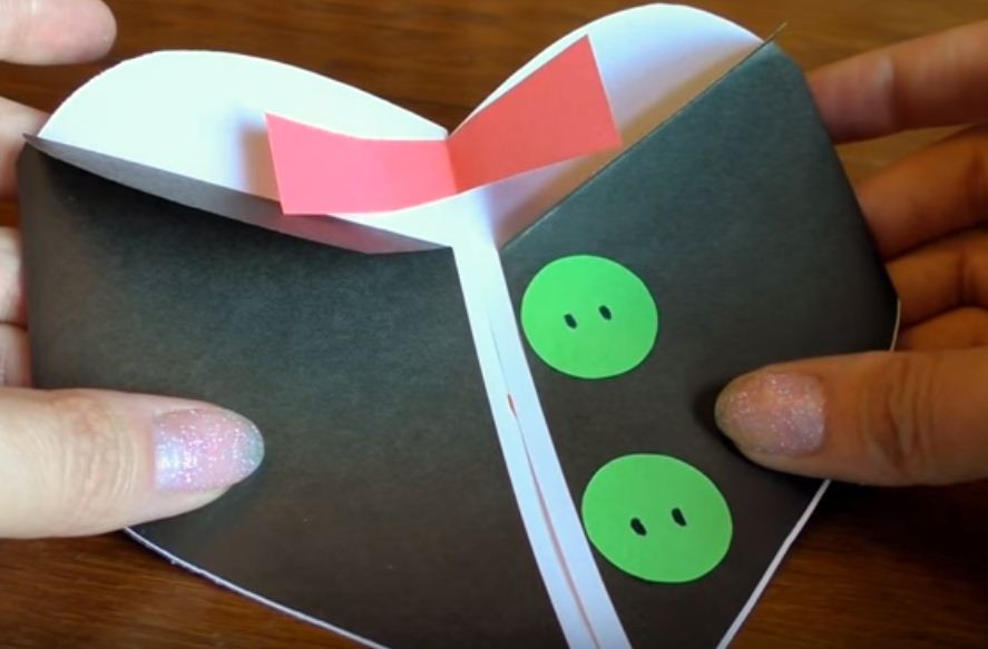 Белую бумагу необходимо обернуть черной, согнуть пополам. Развернуть и снова согнуть, край должен доходить до середины. Сложить последний раз. С помощью простого карандаша нарисовать сердце. Аккуратно вырезать, получится сердце, снаружи черное, внутри белое. Черную часть сверху необходимо загнуть, это будет воротник. Промазать черную бумагу клеем и прикрепить к белой. Из желтой бумаги вырезать пуговицы, фломастером нарисовать отверстия. Далее их необходимо приклеить на сердце. Из красного листа вырезать бабочку, прикрепить к пиджачку.