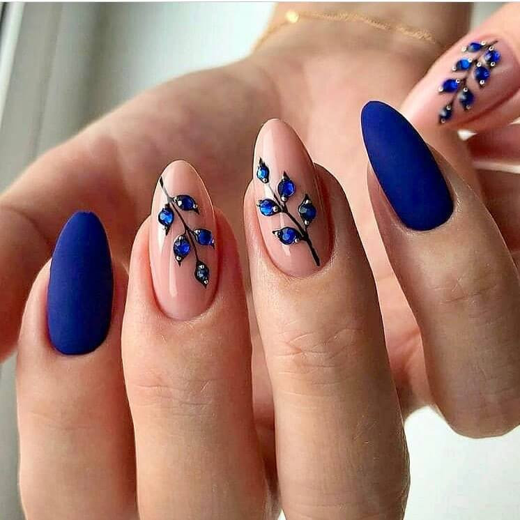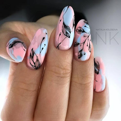 Весенняя тенденция – маникюр с веточками и мелкими цветами. Такой рисунок можно легко нарисовать с помощью лайнера и кисти, а также можно использовать готовые водные наклейки. Этот дизайн ногтей будет выглядеть нежно и лаконично, а главное, его можно выполнить на любом фоне — пастельном, темном или ярком.