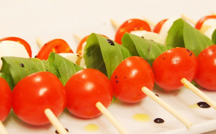 Помидоры разрезаются пополам. На шпажку нанизывается половина черри, листок базилика, небольшой кусок сыра, затем опять базилик и вторая полона черри. Перед подачей канапе поливаются бальзамическим соусом.