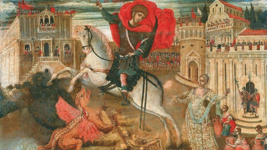 Предание гласит, что Георгий сотворил чудо — убил змия, который требовал человеческих жертв, и никто не мог его остановить. Когда чудище потребовало царскую дочь, святой Георгий именем Господа низвергнул его, пронзив копьем. Отныне жители царства были в безопасности, а кроме того, поверили в Слово Божие и приняли христианство.