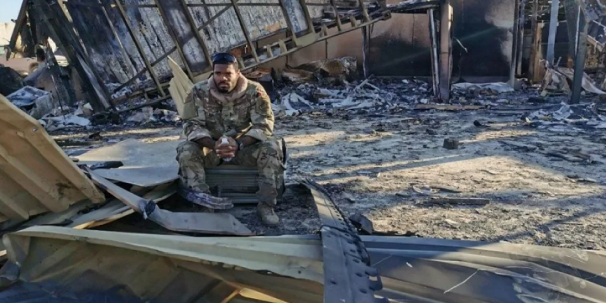Американский морпех на обломках того, что было крупнейшей авиабазой США «Аль-Асад» в географическом центре Ирака после атаки 10 тактических ракет «Fateh-110» в рамках операции «Мученик Сулеймани». Фото АР