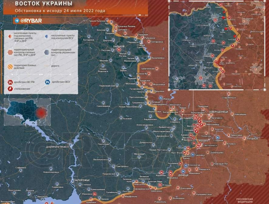 Сводка Минобороны России о ходе проведения специальной военной операции на территории Украины и продвижении российских войск по состоянию на 25 июля 2022 года.