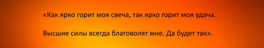 Если в жизни не хватает удачи, тогда можно провести этот мощный ритуал с оранжевой свечой. Выберите комнату, где вам никто не помешает, и зажгите свечу. Сверху и вокруг посыпьте травой зверобоя, предварительно высушенной и измельченной. Глядя на пламя, прочитайте молитву: