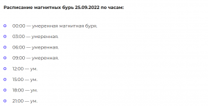 25 сентября 2022 года будет наблюдаться не самая слабая категория геомагнитных бурь — умеренная или средняя, причём весь день. Она окажет небольшое воздействие на метеочувствительных людей. Но иногда такие возмущения приносят организму немало проблем.