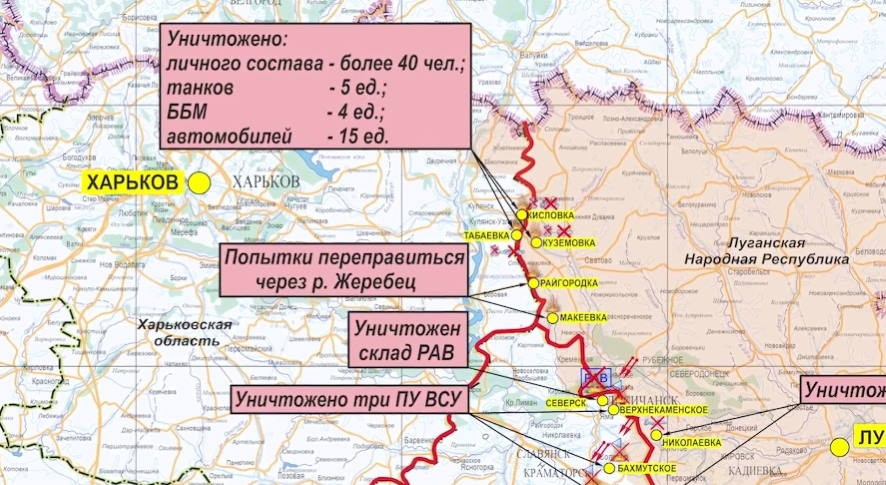 На Краснолиманском направлении подразделения ВСУ безуспешно пытались форсировать реку Жеребец в районах населенных пунктов Макеевка и Райгородка Луганской народной республики. Сосредоточенным огнем ракетных войск и артиллерии все попытки ВСУ навести переправы через реку были сорваны.