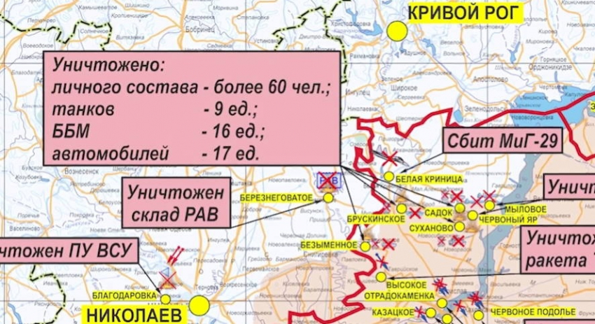 На Николаево-Криворожском направлении вооруженные силы Украины вели наступательные действия силами до трех батальонных тактических групп и подразделения иностранных наемников в направлениях населенных пунктов Брускинское, Безыменное, Садок и Суханово Херсонской области.