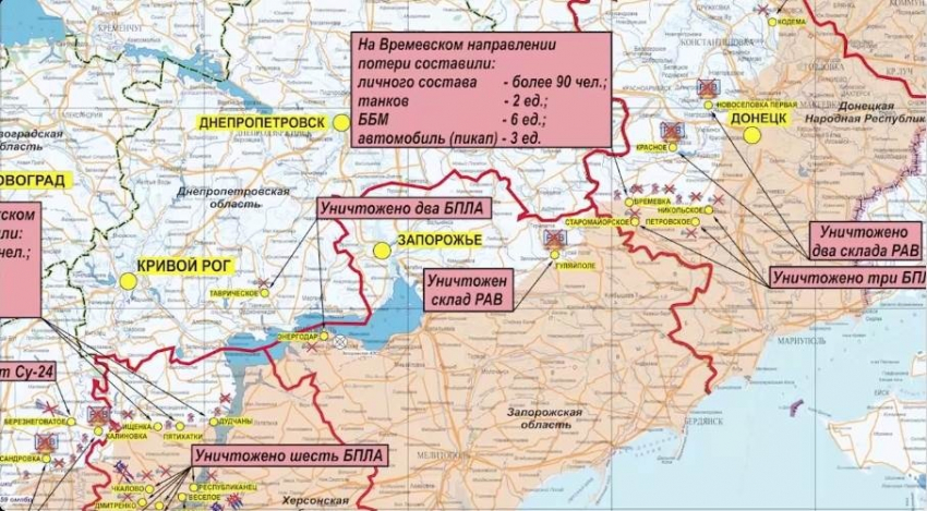 Вооруженные силы Украины (ВСУ) провели ряд безуспешных атак на Купянском и Николаево-Криворожском направлениях, потеряв более 160 человек, 3 танка, 13 броневиков и 11 пикапов. Кроме того, ВС РФ нанесли удары по расположению иностранных наемников и 59-й бригады ВСУ, уничтожив более 170 боевиков и 13 единиц техники.