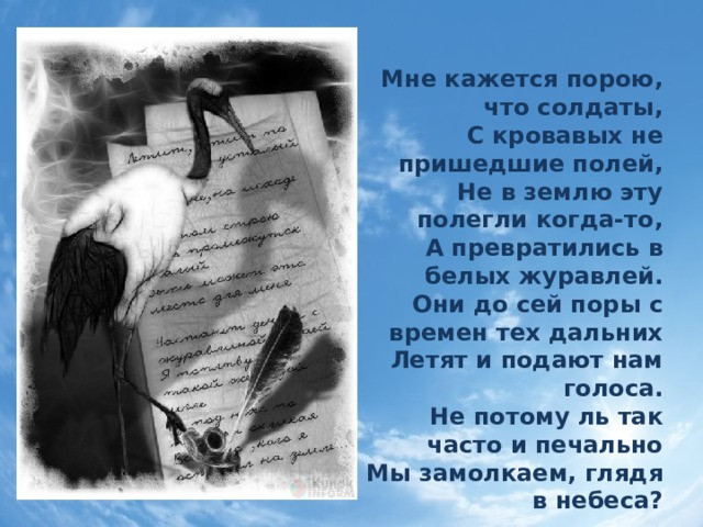 Белый журавль, воспетый в стихах, это стремление человека стать ближе к Богу, стать чище душевно, поверить в то, что жизнь не настолько материальна, как о ней говорят. Души умерших солдат хотят свободы, поэтому превращаются в птиц. Ведь нет в мире ничего более свободного, чем клин журавлей, летящих туда, куда им нужно.