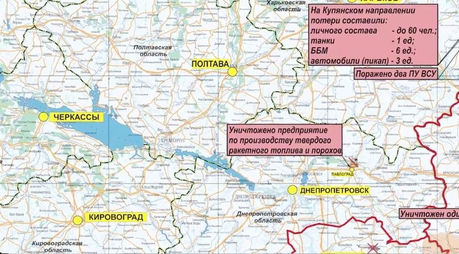 В районе города Павлоград Днепропетровской области уничтожено украинское оборонное предприятие по производству твёрдого ракетного топлива, взрывчатых веществ и порохов для ВСУ.