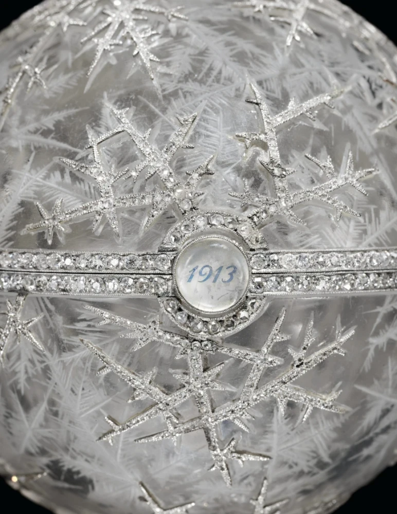 Это яйцо, выполненное из горного хрусталя, обладает внутренней гравировкой, напоминающей иней, и внешним декором в виде платиновых снежинок.