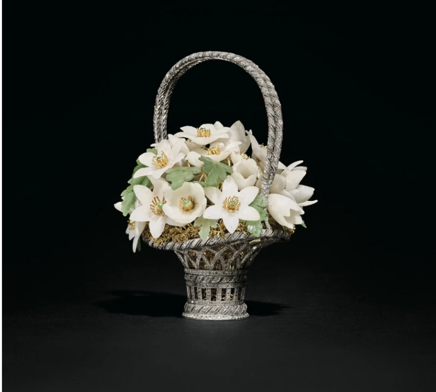 При открытии яйца появляется подвешенная на платиновом крючке корзина из плетеного металла, усыпанная бриллиантами и наполненная искусно вырезанными анемонами из белого кварца. Цветы имеют золотистые стебли и тычинки, а в центре каждого из них расположен гранат-демантоид. Листья сделаны из нефрита, а на дне корзины выгравировано "FABERGÉ 1913".