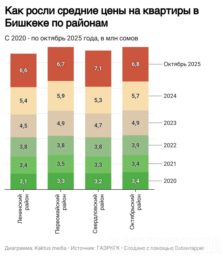 Согласно данным за октябрь, средняя цена квартир в Свердловском районе составляет 7 млн сомов, в Октябрьском - 6,8 млн сомов, в Первомайском - 6,7 млн сомов, а в Ленинском - 6,6 млн сомов.[url=https://argumenti.kg/uploads/posts/2025-12/1765530613-21765530407-2ws.webp]