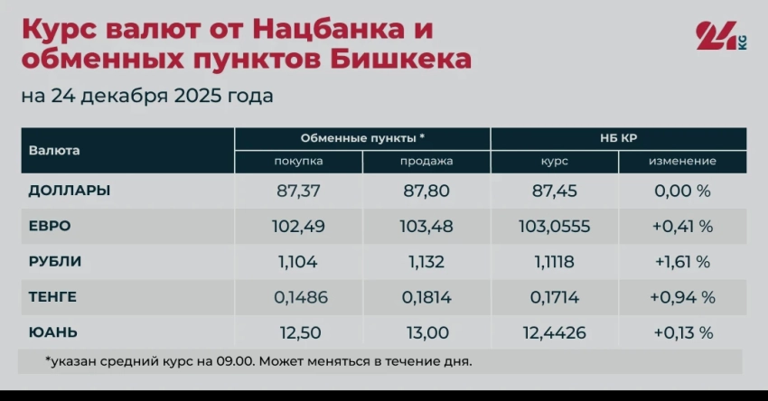 - Средний курс в обменниках: покупка — 102,49 сома, продажа — 103,48 сома.