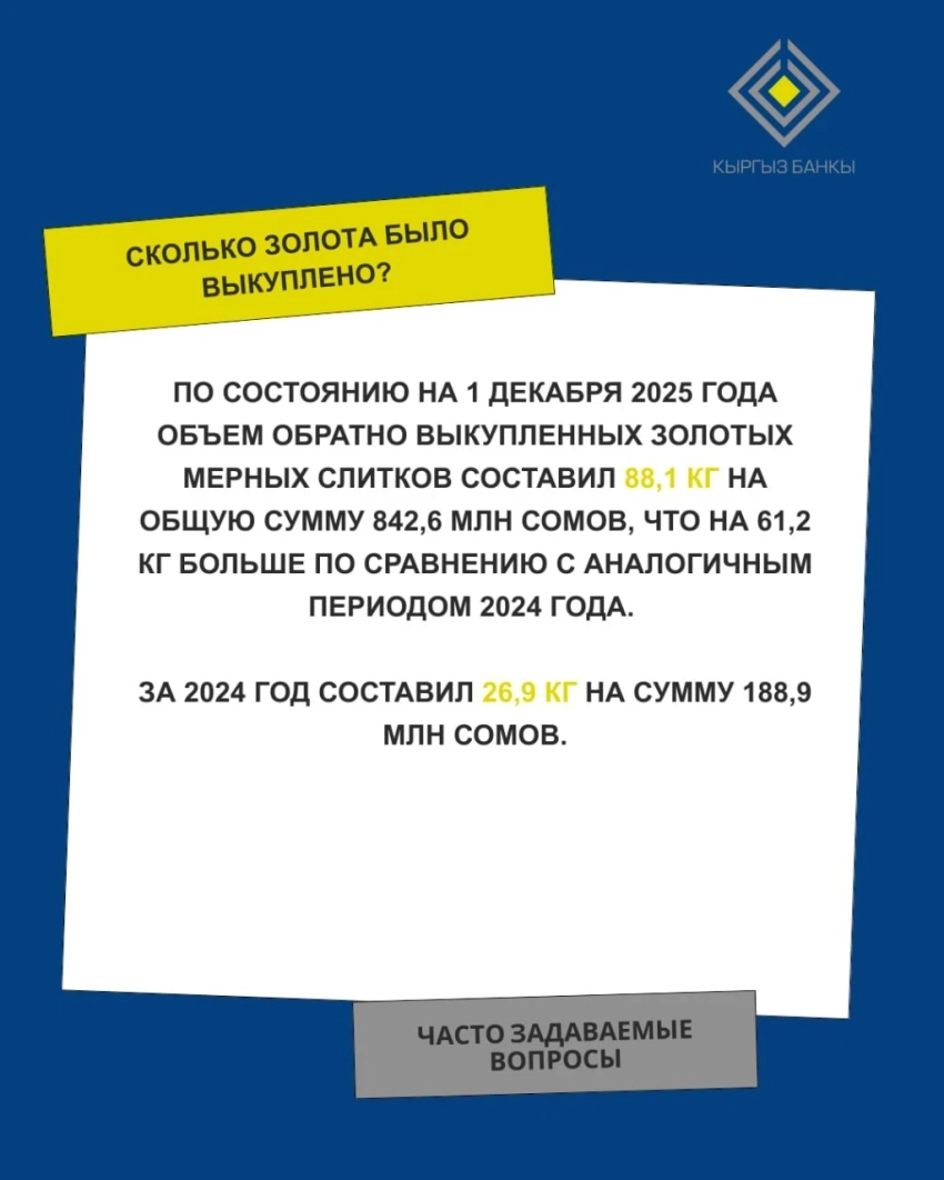 По состоянию на 1 декабря 2025 года, продажи золотых слитков достигли 182,6 килограмма, что в денежном эквиваленте составило 1 миллиард 854,5 миллиона сомов. Это на 133,1 килограмма больше, чем в аналогичном периоде 2024 года, когда было продано всего 49,5 килограмма золота.