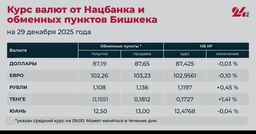 - Курс, установленный НБ КР: 87,425 сома (уменьшение на 0,03 процента), что стало первым изменением за два месяца.