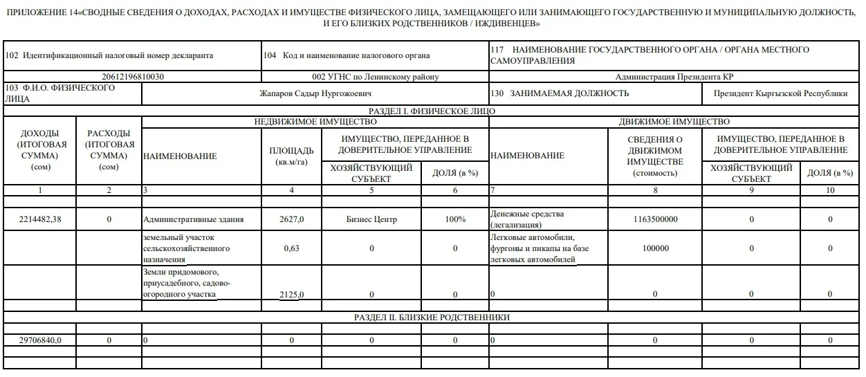 Кроме того, президент владеет легковым автомобилем, стоимость которого составляет 100 тыс. сомов. Он также легализовал имущество на сумму 1 млрд 163,5 млн сомов.