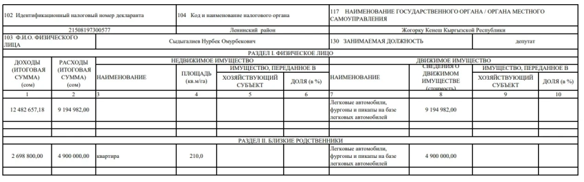 Близкие родственники Сыдыгалиева задекларировали доход в 2 млн 698,8 тыс. сомов и расходы в 4,9 млн сомов. В их активе есть квартира площадью 210 кв. м и автомобили на сумму 4,9 млн сомов.