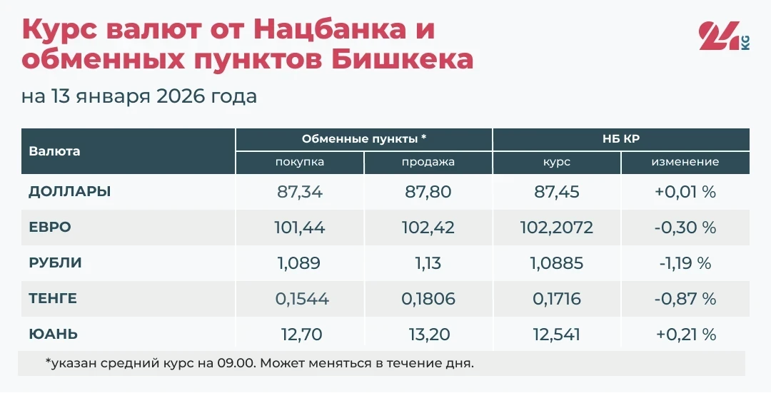 На 13 января текущего года официальные курсы валют демонстрируют интересные изменения. В то время как доллар США и китайский юань подорожали, евро, российский рубль и казахстанский тенге, наоборот, стали дешевле. Эти данные предоставлены Национальным банком Кыргызстана, а также обменными пунктами в Бишкеке.