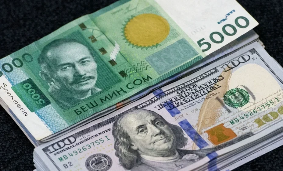 В коммерческих банках средняя цена покупки доллара составляет 87,34 сома, а продажа — 87,81 сомов.