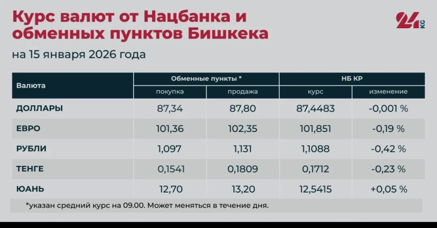 На основании данных Национального банка Кыргызстана и обменных пунктов Бишкека, 15 января отмечается снижение курсов доллара, евро, российского рубля и казахского тенге, в то время как китайский юань показывает рост.
