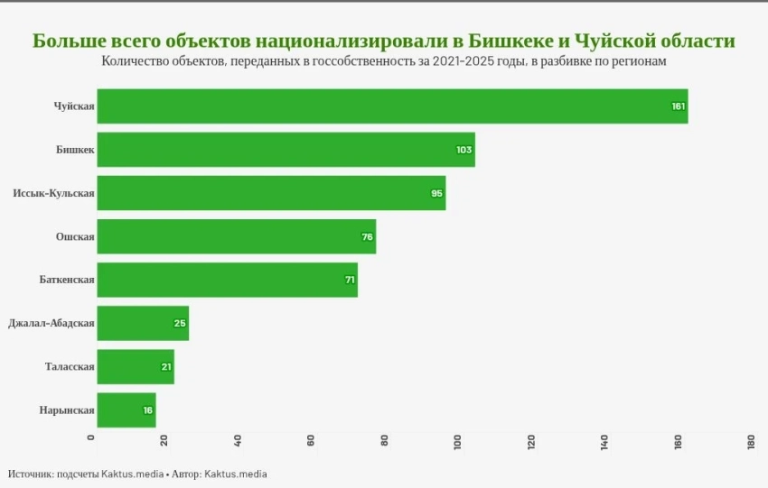 Как и ожидалось, наибольшее количество объектов было возвращено в Чуйской области, как по количеству, так и по общей стоимости. В то же время Таласская и Нарынская области остаются регионами с наименьшим количеством незаконно переданного в частные руки имущества — в восемь и десять раз меньше объектов соответственно по сравнению с Чуйской областью.