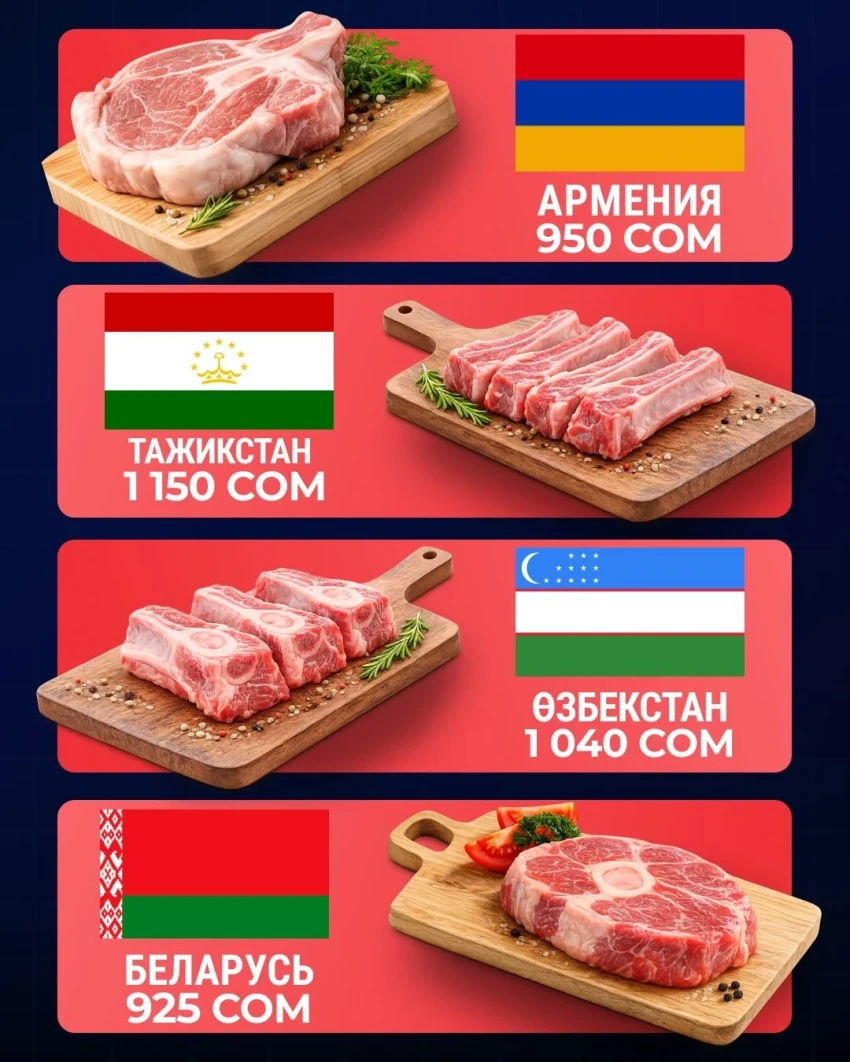Орозбаев также отметил, что несмотря на более низкий уровень средней заработной платы в Узбекистане по сравнению с Кыргызстаном, цены на мясо там все же выше. В то же время, в Казахстане, где заработная плата выше, стоимость мяса на кости ниже, чем в Кыргызстане.