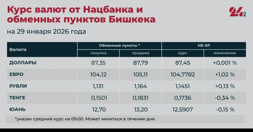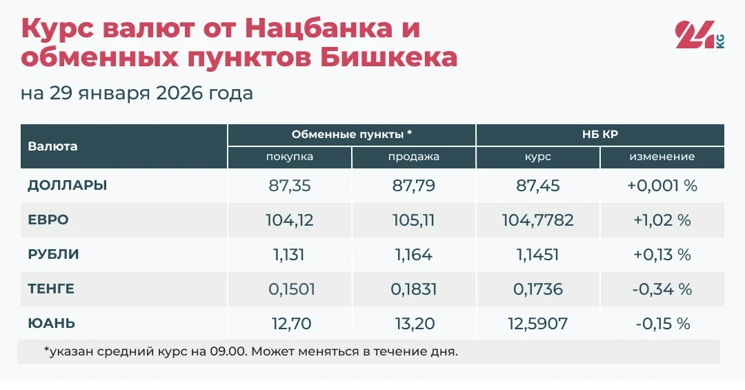 - Официальная ставка НБ КР: 87,45 сома (повышение на 0,001 процента).