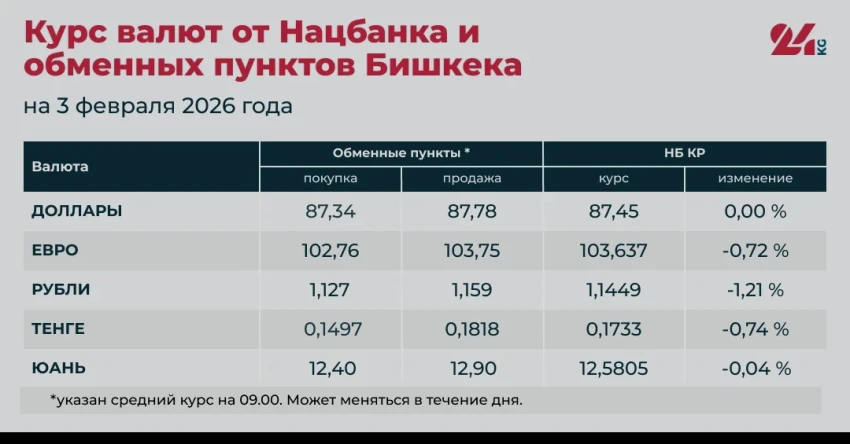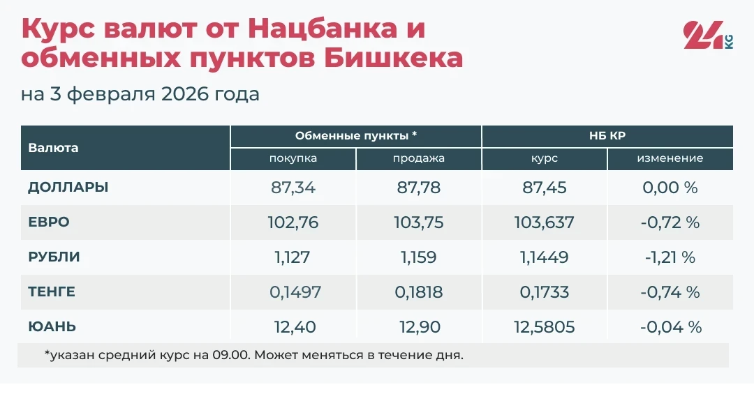 - Официальный курс от НБ КР: 87,45 сома (без изменений).