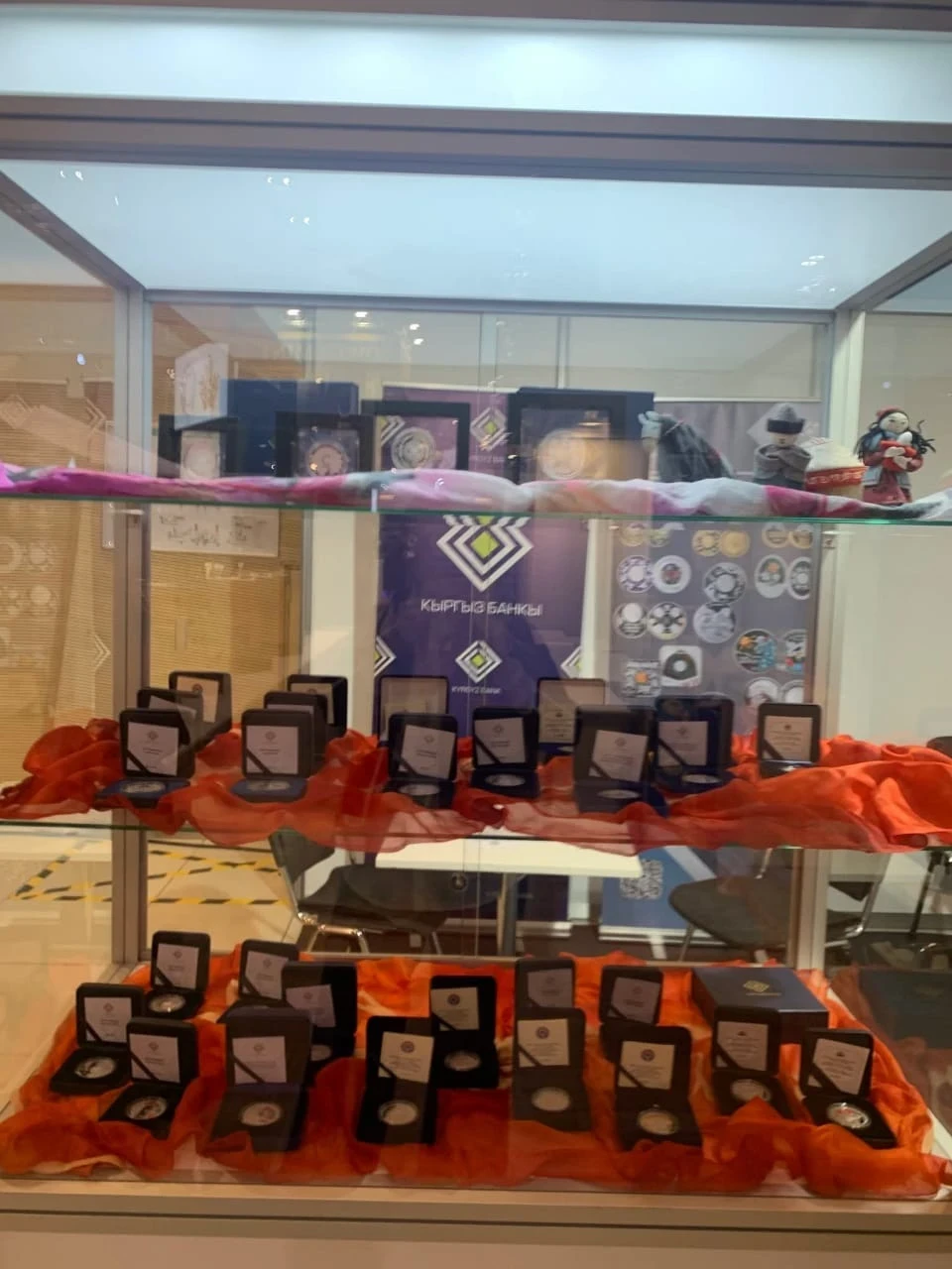 Более 30 банкнот и коллекционных монет составили экспозицию, включая такие серии, как «Исторические события», «Эпоха Кыргызского каганата», «Памятники истории и архитектуры Кыргызстана», «Кыргызские обычаи и обряды», «Национальные музыкальные инструменты», «Национальные виды спорта и народные игры», «Всемирные игры кочевников», а также «Красная книга Кыргызстана».