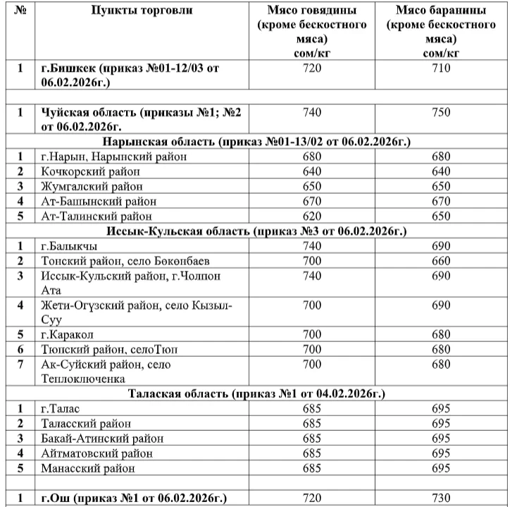 В соответствии с приказом Министерства экономики и коммерции Кыргызской Республики, изданным 30 января 2026 года под номером 3, было введено временное государственное регулирование цен на мясо. Это касается говядины и баранины (исключая бескостное мясо) на территории страны. В результате работы территориальных отделов Службы антимонопольного регулирования были установлены новые максимальные цены на указанные виды мяса: