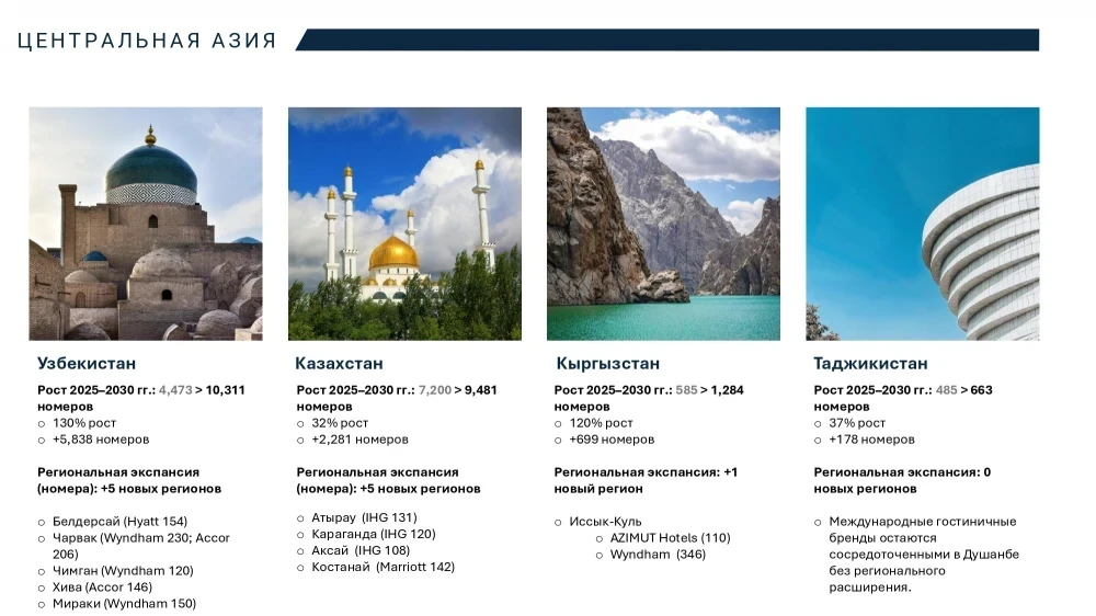 Центральная Азия стремительно превращается в один из новых туристических центров, объединяющих наследие Шелкового пути, объекты ЮНЕСКО, живописные горные пейзажи и уникальные культурные впечатления. Регион привлекает как любителей культурных маршрутов, так и тех, кто предпочитает медицинский, экологический или гастрономический туризм. В прошлом году более 15 миллионов туристов посетили страны Центральной Азии.Среди гостиничных сетей наибольшую активность проявляют Accor и Hilton, открывающие новые объекты практически каждый год (Accor - за исключением 2024 года; Hilton - в 2025 году). Однако в 2024 году ожидается временное замедление после резкого увеличения открытия новых гостиниц, с восстановлением активности в 2025-м.