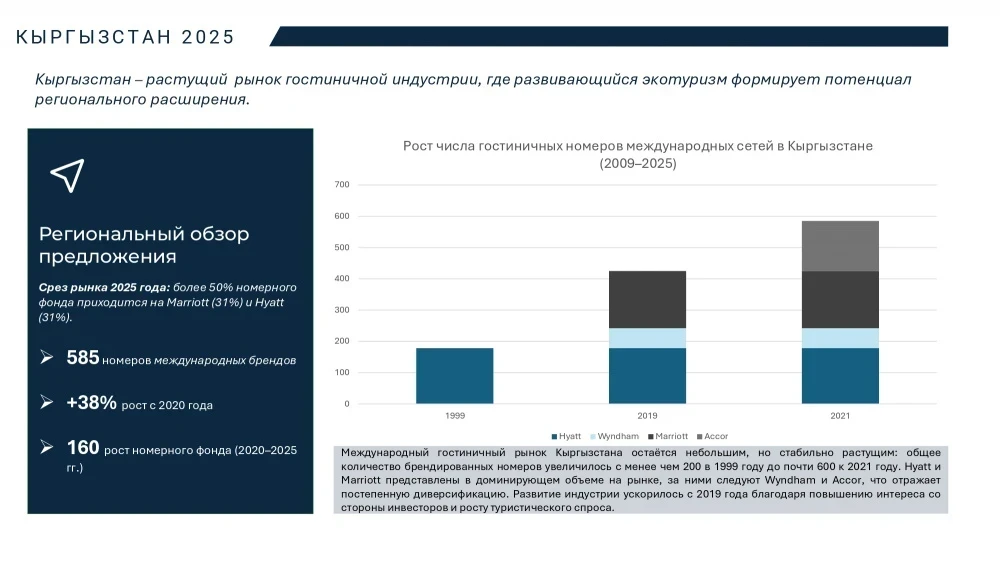 Хотя международный гостиничный рынок Кыргызстана не так велик, он демонстрирует устойчивый рост. Основная часть мировых гостиничных сетей представлена в Бишкеке, включая Hyatt, Wyndham, Accor и Marriott. Спрос на отели формируется в основном за счет делового, дипломатического и экологического туризма.Hyatt стал первым международным игроком на рынке, а выход Accor в 2021 году завершил формирование международного гостиничного портфеля страны. В настоящее время Marriott и Hyatt занимают по 31% рынка, Accor - 27%, а Wyndham - 11%. Развитие сектора ускорилось с 2019 года благодаря растущему интересу со стороны инвесторов и увеличению туристического потока.
