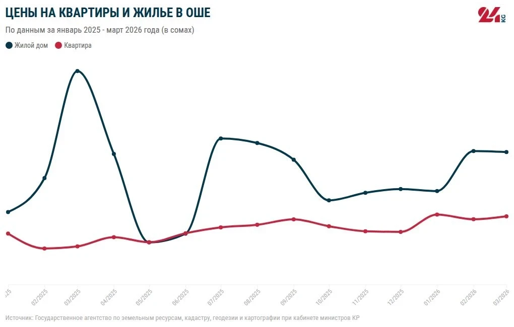 Рекордные цены на дома в Оше были достигнуты в марте 2025 года (181 889,35 сома).