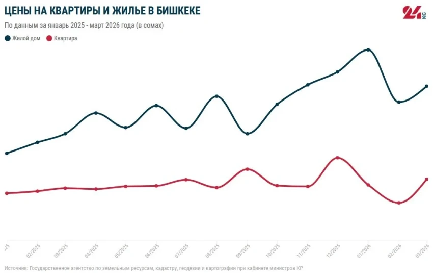 Квартиры достигли пика в январе 2026 года (86 503,5 сома).