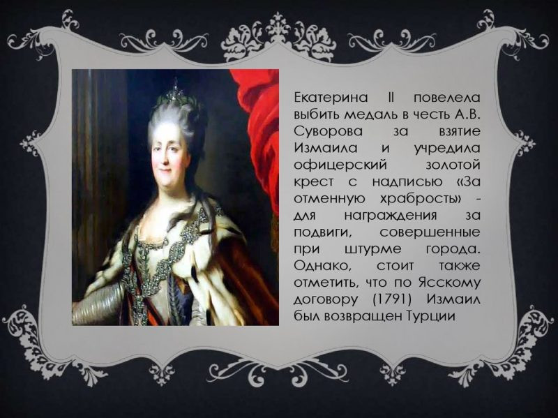 Российская императрица Екатерина II выдала указ о создании золотой наградной медали и креста в честь победы над крепостью Измаил. На кресте была выгравирована памятная надпись «За отменную храбрость».