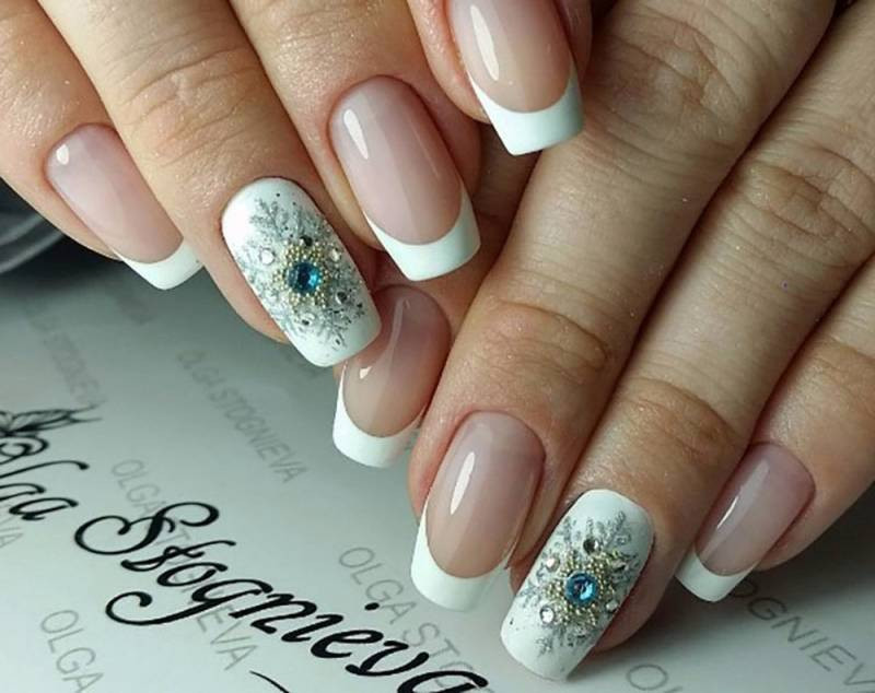 Другим вариантом можно применить то, чтобы сделать, к примеру, все пальцы со стандартными белыми дугами, а безымянный палец покрыть весь блестящими камнями, или выложить из них какой-нибудь красивый и необычный узор.Для любительниц интересного маникюра, можно наклеить на ногти новогодние и зимние атрибуты: снежинки, снеговики, подарки, ёлочки, ёлочные игрушки и подобное.