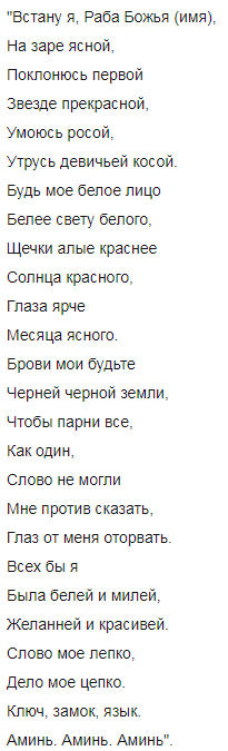 КАК ВЕСЬ МИР В ЗЕРКАЛО ГЛЯДИТСЯ, НА СВОЕ ОТРАЖЕНИЕ ЛЮБУЕТСЯ, ТАК БЫ НА МЕНЯ ПАРНИ ЛЮБОВАЛИСЬ, СО МНОЙ МИЛОВАЛИСЬ И ЦЕЛОВАЛИСЬ, ДА НАПЕРЕБОЙ СВАТАТЬСЯ КО МНЕ РВАЛИСЬ. ВО ИМЯ ОТЦА И СЫНА И СВЯТОГО ДУХА. АМИНЬ.