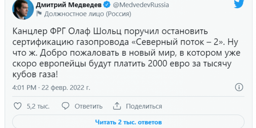 Но хорошо смеется тот, кто смеется последним. И европейцы сами выкопали себе яму. И сами в нее попадут. На это намекнул Дмитрий Медведев, написав у себя в Твиттере, что скоро европейцы начнут платить по 2000 евро за тысячу кубов газа. А что этот его твит, по сути, означает?