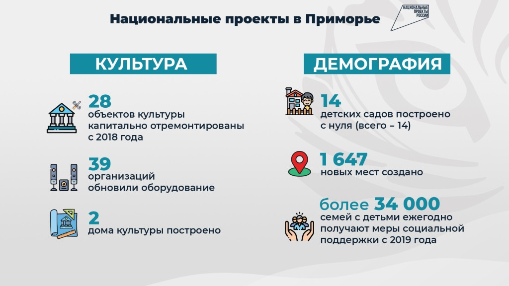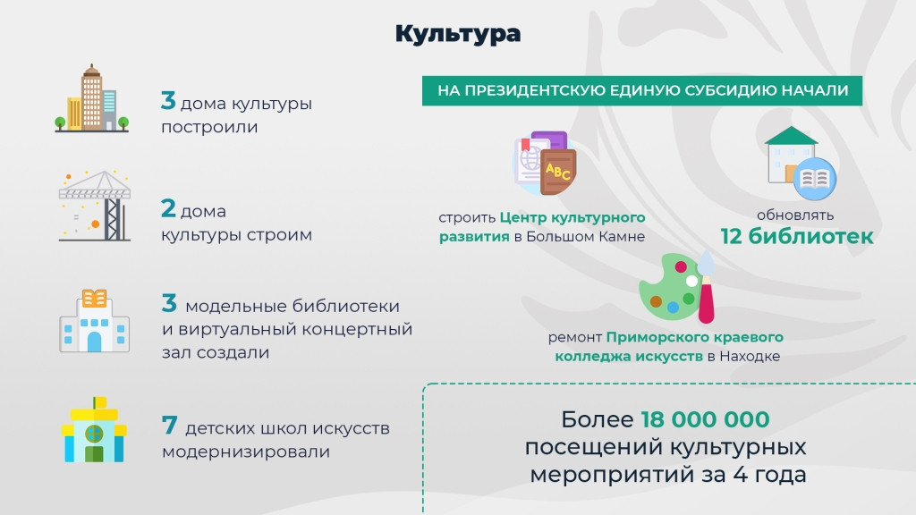 С 2018 по 2022 годы выполнен капитальных ремонт 28 объектов культуры. 39 организаций Приморья получили современное оборудование. Построены три дома культуры в Надеждинском районе и Чугуевском округе.