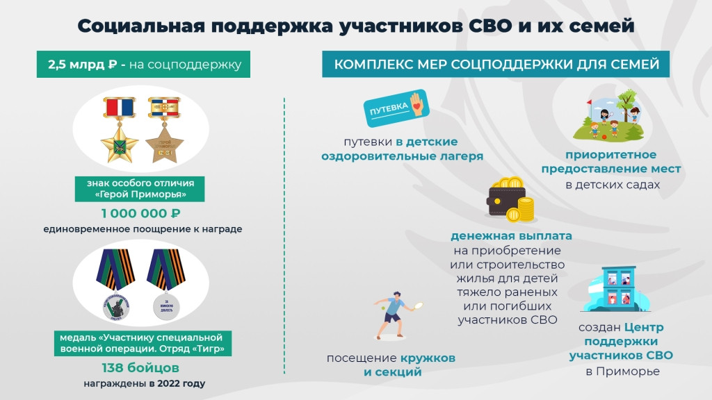 Чтобы отметить заслуги наших бойцов, мы учредили знак особого отличия “Герой Приморья”. К награде выплачивается единовременное поощрение — 1 миллион рублей. Также учредили медаль “Участнику специальной военной операции. Отряд “Тигр””. В 2022-м году ею награждены 138 бойцов.
