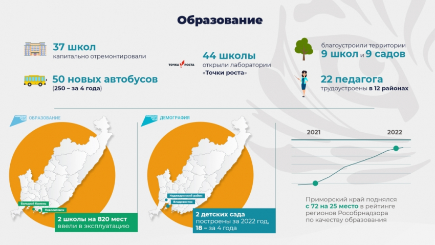 На развитие образования мы направили в 2022 году 34 миллиарда рублей. И что стоит за этой суммой? Приморский край поднялся с 72-го на 25-е место в рейтинге регионов Рособрнадзора по качеству образования. Этому способствует развитие инфраструктуры общего и дополнительного образования, оснащение современным оборудованием, развитие кадрового потенциала.