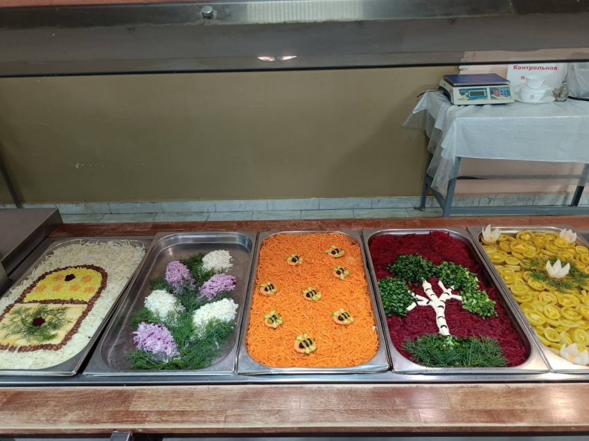 Еще одна особенность современного армейского питания – салат-бар. Если основные блюда строго рассчитаны по норме довольствия, то в нем можно брать соленья, овощи, сухарики и другие добавки без ограничений. В честь праздника салат-бары также получили тематическое оформление. Например, в Воронеже стойку украсили ободряющей надписью.