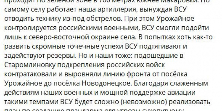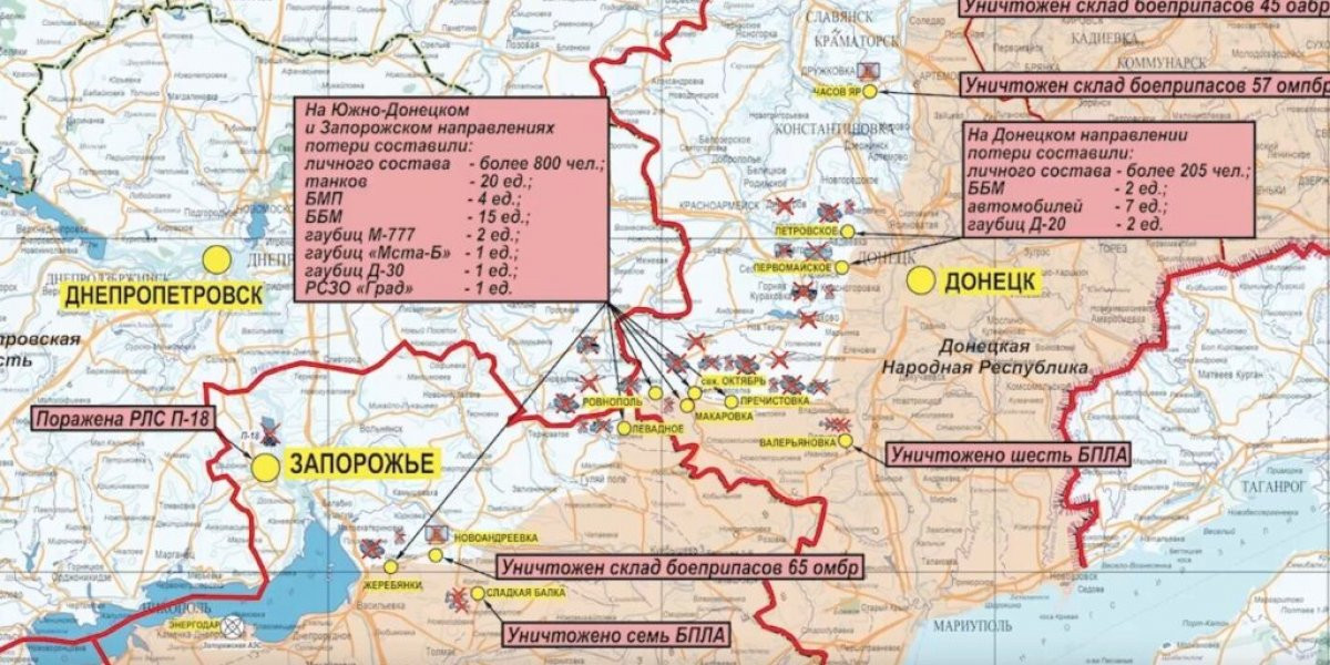 Министерство обороны России заявило в ходе брифинга об отражении атак ВСУ в районах Макаровки и Пречистовки, а также уничтожении техники противника в районе Ровнополя. Кроме того, сорваны попытки наступления украинской армии у Петровского и Первомайского. В районах Северска Малого и Часова Яра уничтожены склады боеприпасов ВСУ. У Григоровки ликвидирована украинская диверсионно-разведывательная группа (ДРГ).