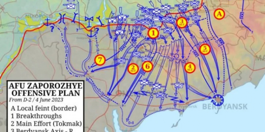 По соцсетям разлетелся некий секретный план ВСУ о готовящемся главном ударе в ходе начавшегося контрнаступления. Карта, которую публикуют американцы, показывает основные точки якобы готовящегося прорыва. Судя по схеме укронацисты планируют захватить Бердянск, выйти к Азовскому морю и прорезать сухопутный коридор в Крым. Последние новости о ходе военной спецоперации на Украине на сегодня, 16 июня 2023 года, новая карта боевых действий на Украине в материале «Интересной России».