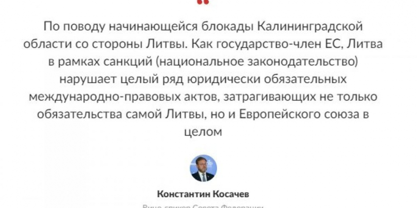 Зарождающаяся блокада Калининграда является нарушением международного права, заявил сенатор Константин Косачев.
