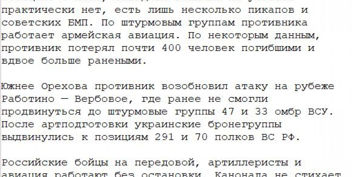 Запорожское направление: в районе Пятихаток не прекращаются тяжелые бои, ВСУ несут сильнейшие потери — гибнут и опытные боевики, и недавно мобилизованные. Также ВСУ атакуют на рубеже Работино — Вербовое. На Времьевском выступе враг продолжает атаковать позиции России в районе Урожайного, при этом неся потери в предполье.