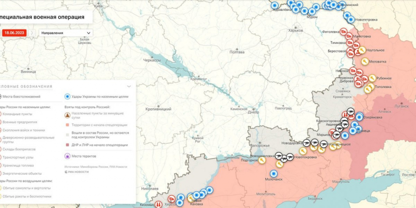 - Карта боевых действий на Украине, к утру 19 июня 2023г., от РИА Новости. Карта специальной военной операции.